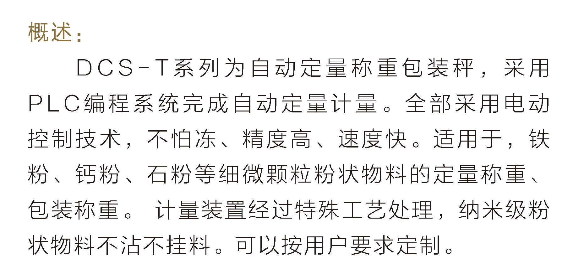 DCS-T系列自动定量称重装置为铁粉(磁粉)定量自动称重计量装置。采用PLC编程系统完成自动定量计量。定量称重装置全部采用电动控制技术,控制传动机构采用高可靠的仪表专用电动机驱动,控制信号采用数字IC感应技术,配套高分辨率的称重仪表与称重传感器,并采用低频脉冲清料技术,供料系统设有快速供料与补偿供料装置,称量速度快,精度高,称量系统不挂料,稳定性好。钢材采用防磁不锈钢。